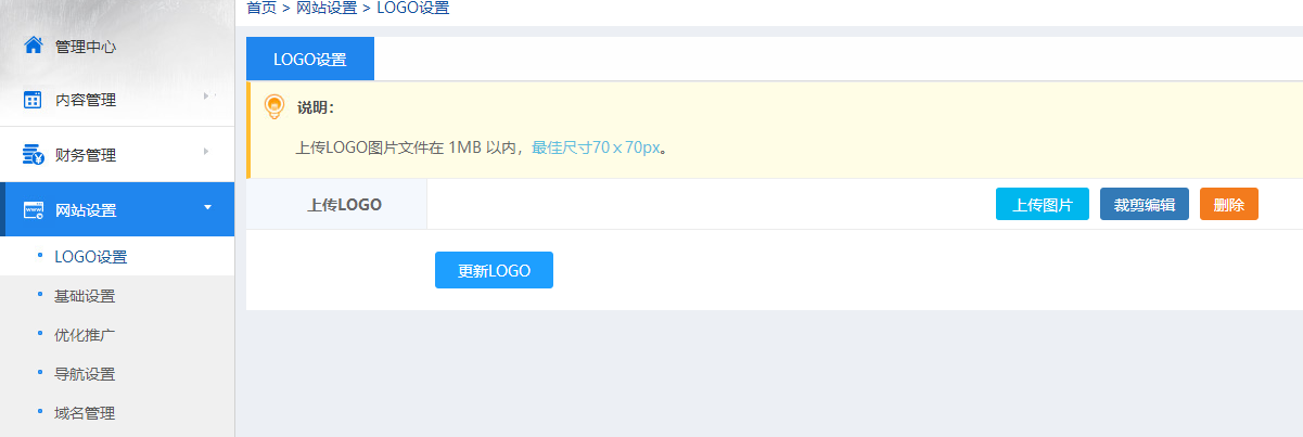 1、登陆后台,进入管理中心-网站设置-logo设置;