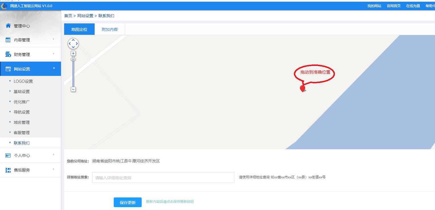 1、如果发现联系我们页面中的地图标注错了,那么我们登入后台,进入管理中心--左侧网站设置(个别在内容管理中)--联系我们-地图定位