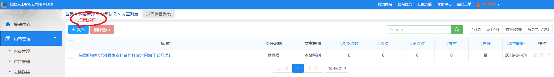 1、登入后台,进入内容管理-找到需要发布在哪个栏目(以公司新网为例)--左上角有发布2、